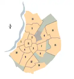 Innerhalb des Ersten Rings liegt das alte Stadtzentrum mit seinem schachbrettartigen Straßennetz, in dessen Zentrum sich der als Flanierpunkt beliebte Platz des 24. September (Plaza 24 de Septiembre) befindet, in dessen Umgebung Santa Cruz noch den kleinstädtischen Charme der spanischen Kolonialzeit bewahrt hat. Ein Großteil der Gebäude wird von Vordächern mit Säulen geziert.[4] An dem zentralen Platz befinden sich neben der Kathedrale von Santa Cruz de la Sierra, der Präfektur und dem Rathaus auch das Kulturzentrum sowie beliebte Restaurants und Kinos. Wenige Straßen nördlich befindet sich der kleine, um einen Teich gelegene Parque El Arenal („Sandgruben-Park“) mit dem „Ethnofolklorischen Museum“ (Gebräuche, Kleidung sowie Musikinstrumente der Ureinwohner), in dessen Umgebung ebenfalls Kinos, Restaurants, Kneipen und Diskotheken liegen.