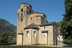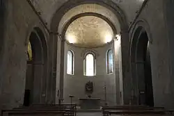 Die Kirche ist über dem Grundriss eines lateinischen Kreuzes errichtet. Sie besitzt ein Querschiff und drei Apsiden. Das Langhaus, das noch aus dem 11. Jahrhundert stammt, ist einschiffig und in zwei Joche gegliedert. Es ist mit einem Tonnengewölbe gedeckt, das auf Pilastern mit Säulenvorlagen und Kapitellen mit figürlichen Szenen ruht. Am Gewölbeansatz verläuft ein Schachbrettfries, der sich auch in der Apsis fortsetzt. Ein doppelter Triumphbogen führt zum Chorraum. Die kreuzrippengewölbten Querhausarme öffnen sich im Osten zu kleinen, halbkreisförmigen Apsisnischen.