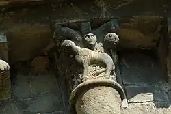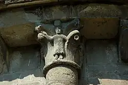 Unter dem Vordach des Hauptportals, dem Dachansatz der Apsis, der beiden seitlichen Apsiden und dem nördlichen Querhaus verlaufen, meist mit Schachbrettfries verzierte Gesimse, die auf zahlreichen Kragsteinen mit Menschen- und Tierdarstellungen aufliegen. Man kann Schlangen, einen Hasen, Köpfe und Früchte erkennen.