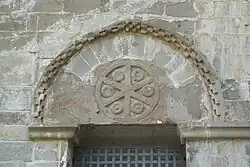 An der Westfassade der Kirche öffnet sich das Hauptportal. Ein weiteres Portal, das wahrscheinlich als Zugang zum nicht mehr erhaltenen Kreuzgang diente, befindet sich an der Südseite. Es wird von einer Archivolte mit Röllchenfries überfangen und besitzt ein Tympanon, auf dem ein sechsspeichiges Rad mit sechs Blütenknospen dargestellt ist.