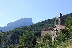 Der abgelegene Weiler Badaín war ursprünglich ein Nonnenkloster des Benediktinerordens.[3] Dessen romanische Kirche auf einer Höhe von 738 Metern wurde in der zweiten Hälfte des 16. Jahrhunderts vergrößert, dabei umgestaltet und der Turm hinzugefügt, der sich heute vom Rest des Komplexes abhebt. Nachdem sie zeitweise nur eine Einsiedelei war, wurde sie später zu einer Pfarrkirche.