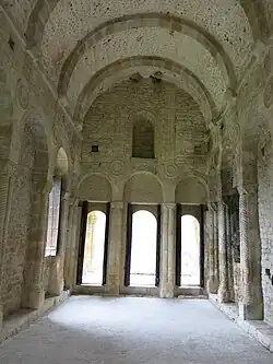 Die zentrale Halle misst 12,7 Meter × 4,4 Meter und ist 7,4 Meter hoch. Entlang ihrer Innenwände verlaufen Blendarkaden mit überhöhten Rundbögen – drei Bogenstellungen an den Schmal- und sieben an den Längsseiten. Sie sind rhythmisiert, werden von außen nach innen immer höher und breiter. Die sie tragenden Säulen bestehen aus je vier Strängen, die gewunden und kanneliert oder mit Taubändern verziert sind. Sie tragen Pyramidenstumpfkapitelle, auf denen Tiere (vor allem Vögel und Löwen) und kleine, auf Stöcke gestützte Personen dargestellt sind. Auf der dem Eingang gegenüber liegenden Seite der großen Halle befindet sich eine weitere Tür. Sie führte ehemals auf einen Austritt, den ein Anbau trug. Der Austritt ist nicht, der Anbau nur in Mauerresten erhalten.