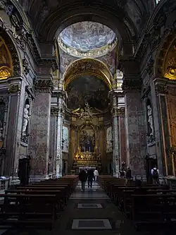 Die Architektur des Innenraumes ist eine hochbarocke Abwandlung der Kirche Il Gesù. Er ist von der Grundstruktur her eine Hallenkirche mit einer Kuppel über der Vierung und einem Chor. Die Arme des Querhauses sind sehr kurz, insgesamt hat die Kirche einen rechteckigen Grundriss.[9] Das Langhaus ist als eigenständiger Baukörper ausgeführt und folgt einem langgezogenen Oktogon als Grundform,[4] seitlich sind flache Kapellen eingefügt.