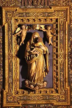 Die Ikone (siehe oben) befindet sich in einem kostbaren weißen Marmorschrein. Die 3,68 m hohe und 2,46 m breite Ädikula wird von einigen als Werk des Tommaso Malvito (1510) betrachtet, während andere es Bartolomé Ordóñez oder Giacomo Brixia zuschreiben.[14] Den Rahmen bilden zwei äußere Pilaster mit je vier kleinen Nischen, in denen Statuen von Heiligen und Propheten stehen. Im Zentrum des dazwischenliegenden Bogens befindet sich das Madonnenbild, in der Lünette direkt über dem Bild schwebt die Taube des Heiligen Geistes, das Ganze wird von Engeln umfangen, vier an den Seiten und ein Halbkreis von fünf Seraphim darüber.[14] Unter der Madonna ist ein kleines Relief mit zwei Engeln, die das Schweißtuch der Veronika mit dem Antlitz Christi halten, und darunter ein größeres Relief mit der Auferstehung, umgeben von weiteren Heiligen-Skulpturen.[14]