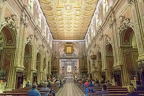 Das Innere der Kirche besteht aus einem einzigen Schiff mit Seitenkapellen und der Apsis mit der Kapelle der Madonna Bruna am Ende. Sie ist 75 Meter lang und 19 Meter breit, die Höhe beträgt 16 Meter.[12] Das Schiff wird nach oben von einer prächtigen teilvergoldeten Kassettendecke abgeschlossen; von den fünf Reihen Kassetten sind zwei mit großen sechzehnstrahligen Sternen besetzt und in der Mitte schwebt eine Madonna mit Kind auf Wolken, deren Darstellung an die Madonna Bruna angelehnt ist (siehe Abb. unten). Auf der Empore aus vergoldetem Holz (17. Jahrhundert) über den drei Eingangstüren steht die große monumentale Orgel (siehe unten).[12]