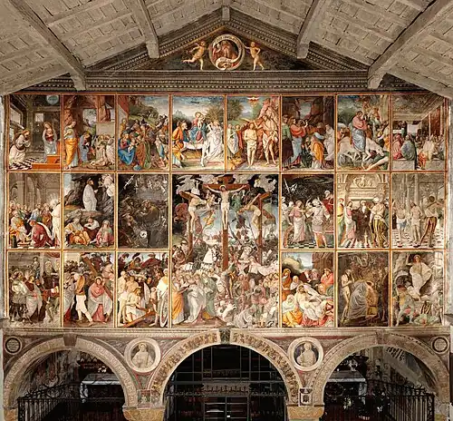 Die von Gaudenzio Ferrari ausgeführten Fresken stellen eines der Meisterwerke der Renaissance-Malerei im Piemont und in der Lombardei dar. Sie erzählen Das Leben und den Leidensweg Christi mit Szenen, die eine Fläche von 10,4 × 8 m einnehmen: zwanzig gleich große Flächen erzählen – nach einem traditionellen geometrischen Schema, das für die pädagogische Funktion der Biblia pauperum ersonnen wurde – die wichtigsten Begebenheiten der evangelischen Schilderung von der Verkündigung bis zur Auferstehung Christi. Eine weitere Szene von vierfacher Größe im Mittelpunkt der Wand stellt den dramatischen Höhepunkt der Erzählung und den natürlichen Konvergenzpunkt für den Blick der Gläubigen dar: die Kreuzigung Christi.