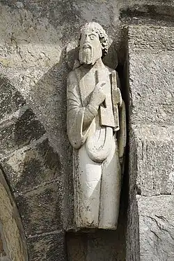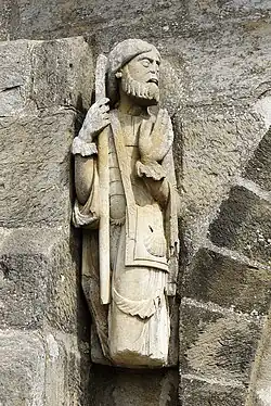Die beiden unvollständig erhaltenen Skulpturen in den Zwickeln des Portals befanden sich ursprünglich nicht an dieser Stelle. Die linke Figur stellt den Apostel Jakobus den Älteren als Pilger gekleidet dar, mit Pilgerstab und Umhängetasche, auf der die Jakobsmuschel prangt. Die rechte Figur stellt vermutlich einen anderen Apostel dar. Beide Figuren stammen aus dem 12. Jahrhundert und weisen Gemeinsamkeiten mit den Bildhauerarbeiten der Kirche San Isidoro in León auf.