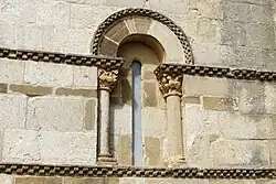 In der Apsis öffnen sich fünf Rundbogenfenster, je eines an den Seiten und drei an der Ostwand. Von diesen drei Fenstern ist nur das mittlere von einer schmalen, schießschartenartigen Öffnung durchbrochen, die beiden äußeren Fenster sind vermauert. Sämtliche Fenster sind von einer schlichten Archivolte umgeben, die auf schlanken Säulen mit aufwändig skulptierten Kapitellen ruht. Auf den Kapitellen sind Löwen, Greife, Vögel und Blattwerk zu erkennen.