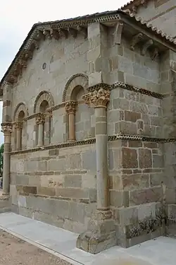 Die Apsis ist – wie üblich bei den Kirchen der frühen Romanik in der Umgebung von Zamora – innen und außen gerade geschlossen, was dem Einfluss westgotischer Bauten wie San Pedro de la Nave zugeschrieben wird. Sie wird seitlich von zwei Säulen begrenzt, die auf der Höhe der Kapitelle der Apsisfenster in Strebepfeiler übergehen. Auf dem Kapitell der nördlichen Säule ist die Anbetung der Heiligen Drei Könige dargestellt. Das Kapitell der südlichen Säule ist mit Akanthusblättern skulptiert. In dem darüber aufragenden Strebepfeiler ist ein wiederverwendetes Kapitell aus westgotischer Zeit mit stilisiertem Blattdekor integriert.