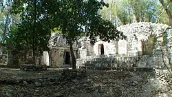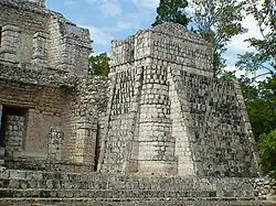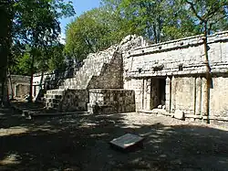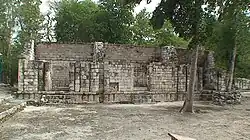 Von dem zu beiden Seiten anschließenden Gebäude sind nur kleine Reste erhalten. Über einem dreigliedrigen Sockel folgt eine, soweit erkennbar, glatte untere Wandfläche. Das mittlere Gesims ist dreigliedrig, in dem vertieften mittleren Band finden sich Gruppen von drei niedrigen Säulchen. Auf der oberen Wandfläche sind ebenfalls Gruppen von drei Säulchen zwischen glatten Wandflächen anzutreffen, die stärker an Formen im Puuc-Mosaikstil erinnern. Das obere Gesims entspricht dem mittleren plus der vorkragenden Steinreihe als oberem Abschluss.