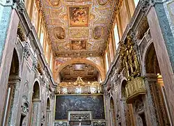 Der Raum erhält einen prägenden Eindruck durch die ganz außerordentliche holzgeschnitzte Kassettendecke in charakteristischem Himmelblau mit goldenen Verzierungen, in die sieben Gemälde eingelassen sind; vier davon stammen von Massimo Stanzione: im Mittelfeld die „Heilige Familie“ (350 × 300 cm)[6] und die „Heilige Dreifaltigkeit“ (400 × 380 cm, in der Mitte)[6], und auf der rechten Seite die „Geburt Christi“[7] und die „Darstellung im Tempel“[7] (beide 130 × 90 cm)[6]. Das dritte Bild des Mittelfeldes, nahe dem Querschiff, ist eine Darstellung der „Verkündigung“ (350 × 300 cm) von Giovanni Bernardino Azzolino (1572–1645)[6], auf der linken Seite befinden sich die „Visitation“ von Belisario Corenzio[7] und eine anonyme Purificazione[7] (beide 130 × 90 cm).[6] Die Decke findet ihre Fortsetzung über dem Nonnenchor, der auf der Empore über dem Atrium liegt (wiederum ganz ähnlich wie in San Gregorio Armeno). Hier befinden sich fünf weitere Gemälde, ein großes in der Mitte und vier kleinere drumherum.