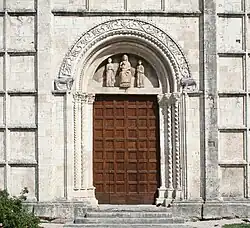 Laut Cesare Mariotti zeigt das Alter des Datums 1036, dass die Skulpturengruppe und die Formteile der Untersicht des Bogens primär in der ältesten Fassade platziert wurden und zur Dekoration der neuen Fassade des 14. Jahrhunderts versetzt und wiederverwendet wurden[52]. Enrico Cesari drückt sich so aus: „Das alte, liebevoll erhaltene Portal wurde in der neuen Fassade verwendet und mit neuen Dekorationen, insbesondere dem Außenbogen, mit Fries und Mäandern und Blättern in aufwendiger Verarbeitung versehen. Die Gruppe wurde für die Fassade in gleichen Quadraten, die innerhalb der Pilaster verteilt waren, übernommen.“[42] Betrachten wir das „Hauptportal, insbesondere den inneren Teil davon, die Lünette und die rauen primitiven Statuen“[41], beide Teile wurden in der Fassade aus dem 14. Jahrhundert wiederverwendet. Er präzisiert, „dass die Tür von 1036 zweifellos älter als die ursprüngliche Kirche ist“, und diese Überlegung leitet sich aus der Beobachtung der Verarbeitung des Travertines ab, aus dem sie hergestellt wurde, im Vergleich zu dem im Kirchenschiff, das mit „wenig Geschick“ gearbeitet wurde[41]. Er definiert die Konstruktion als nicht „isodomisch“, bestehend aus „grob bearbeitetem Material in horizontalen Schichten, die nicht immer perfekt eingehalten wurden und oft mit Ziegelfragmenten ausgeglichen sind“. Er stellt fest, dass sogar die kleinen Fenster mit einfachen Steinen verziert und ausgehöhlt sind, um die Bögen zu erhalten, „wie sie in der Ära des maximalen Niedergangs verwendet wurden“[42]. Im Gegensatz zu dem, was beschrieben wurde, zeigen die Türpfosten „perfekte Verarbeitung“, gute Verbindungen und ein Archivolt aus Keilen die nach der Richtung der Strahlen geschnitten sind[42].