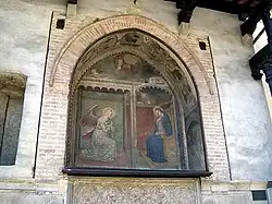 Die Fassade ist bis auf die rechte Achse unverziert, lediglich ein nischenähnliches Rundbogenfenster über dem Portal und oberhalb dessen ein Segmentbogenfenster schmücken sie etwas. Rechts hat sich noch das Portal des Vorgängerbaus erhalten sowie oberhalb dessen ebenfalls ein Fresko, das Spinello Aretino eben für das Oratorium schuf, datiert wird es um das Jahr 1370.[3] Es stellt, dem Patrozinium der Kirche nach, eine Verkündigungsszene dar. Es wird von einem hölzernen Baldachin geschützt.