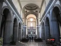 Die Kirche hat eine basilikale Grundstruktur, dementsprechend verfügt sie über drei Kirchenschiffe mit erhöhtem Mittelschiff, die Architektur folgt florentinischen Vorbildern, genannt wird beispielsweise Brunelleschis Santo Spirito. Die Seitenschiffe waren ursprünglich nicht durchgehend, sondern als Konchenkapellen angelegt, erst später wurden sie durch die heutige Struktur abgelöst.[4] Die Vierung ist überkuppelt, in den Pendentifs sind Terrakottarosetten eingefügt. Ebenfalls mit Rosetten verziert ist der Unterzug des Triumphbogens zum Chor hin.