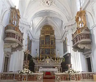 Auch die Dekoration des Chorraums geht zum großen Teil auf Dionisio Lazzari zurück, darunter der marmorne Altar mit kunstvollen Pietra-dura-Intarsien in Form floraler Motive und Arabesken.[4] Das reichgeschnitzte Chorgestühl aus Nussbaumholz stammt aus dem 16. Jahrhundert.[4] Die beiden Gemälde an den Seitenwänden der Apsis schuf Sebastiano Conca 1720: Sie zeigen die Darstellung Jesu im Tempel und die Anbetung der Könige.[4] Der Hochaltar in der Apsis besteht aus einem prächtigen vergoldeten Polyptychon aus dem 16. Jahrhundert, das als Schenkung eines gewissen Giuliano Colojna, Bürger von Gaeta, in die Kirche kam.[4][1] Die Malereien schuf Giovan Filippo Criscuolo aus der Schule von Andrea da Salerno 1521; dargestellt sind: Tod und Auferstehung Christi, die Verkündigung und die Heiligen Johannes der Täufer, Hieronymus, Ambrosius und Petrus.[4] Über dem Hochaltar ist ein vergoldetes reichornamentiertes Gitter angebracht, hinter dem sich der „Waisenchor“ (Coro delle orfanelle) befindet, auf dem Nonnen und Waisenkinder vor neugierigen Blicken geschützt an den Messen teilnahmen.[4]