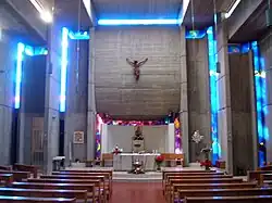 Die Kirche besteht komplett aus Stahlbeton. Im Inneren ist der ein großer Kirchenraum. An den Ecken sind zwei Seitenkapellen mit abstraktem Buntglasfenster, der Eingang und der Altarraum. Im Kirchenraum stehen zwei Statue des Heiligen Antonius und Unsere Liebe Frau auf dem Pfeiler, welche der Andacht dienen. Die Orgel über dem Eingangsportal ist aus dem Jahre 1979.