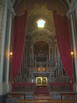 Der Hochaltar (an den Seiten von zwei Engeln mit Füllhorn geschmückt) und die Marmorbalustrade stammen dagegen aus der alten Kirche San Francesco d'Assisi, die sich an der Stelle befindet, an der heute die dem heiligen Alfonsus Maria de’ Liguori gewidmete Kirche steht.[22] Hinter dem Altar befinden sich das hölzerne Chorgestühl und die Orgel, die sich auf einem von Säulen getragenen Zwischengeschoss aus dem 20. Jahrhundert befindet.