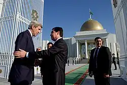 Insgesamt nahmen die diplomatischen Aktivitäten ausländischer Staaten in Turkmenistan mit dem Tod Nyýazows zu und auch die turkmenische Exilopposition versuchte verstärkt Einfluss auf die Entwicklung in Turkmenistan zu nehmen. Auf diplomatischer Ebene war insbesondere Russland an einer raschen Klärung der Machtfrage und politischer Konstanz in Turkmenistan interessiert, um die turkmenischen Erdgas- und Erdöllieferungen nach Russland zu garantieren und eine Destabilisierung im russischen Einflussbereich zu vermeiden.[93] Auf regionaler Ebene war Nyýazows Außenpolitik durch Isolation und die Ablehnung einer verstärkten regionalen Zusammenarbeit gekennzeichnet. Die Regierung Kasachstans drängte demzufolge auf eine Öffnung des Landes und eine Verbesserung der Handelsbeziehungen, während die usbekische Regierung auch aufgrund der langen usbekisch-turkmenischen Grenze vor allem eine friedliche Lösung der Nachfolgefrage anmahnte.[94] Das Verhältnis zu den USA und der Europäischen Union war mit den Verschärfungen der staatlichen Repressionen ab dem Jahr 2002, auf die die USA und die EU mit Sanktionen sowie dem Ausschluss von Entwicklungshilfe reagiert hatten, an einem Tiefpunkt angelangt. Nach der Ankündigung von Reformen durch Berdimuhamedow erfolgte eine vorsichtige Annäherung des Westens zu Turkmenistan.[95]