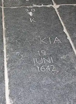 Von dort aus trat Saskia vermutlich im Frühjahr 1633 eine Reise nach Amsterdam an, wo mehrere Familienmitglieder lebten. Sie wohnte dort vermutlich bei ihrer älteren Cousine Aeltje Uylenburgh und deren Mann, dem Prediger Johannes Sylvius. Im Atelier ihres Cousins Hendrick van Uylenburgh, eines führenden Kunsthändlers, muss sie zu dieser Zeit dessen Angestellten Rembrandt van Rijn kennengelernt haben. Am 5. Juni 1633 verlobte sie sich mit ihm in Friesland. Drei Tage später hielt er sie auf dem sogenannten Silberstiftporträt fest, das sich heute im Kupferstichkabinett Berlin befindet.[2] Anschließend reiste er nach Amsterdam zurück – bis zur Hochzeit verging noch mehr als ein Jahr. In dieser Zeit zog Saskia nach Franeker, wo ihre Schwester Antje gestorben war und deren Mann Prof. Johannes Maccovius dringend Hilfe benötigte. Die Ehe mit Rembrandt wurde am 22. Juni 1634 in Amsterdam registriert. Die kirchliche Hochzeit fand am 2. Juli 1634 in Sint Annaparochie in Friesland statt. Danach zog Rembrandt mit ihr nach Amsterdam, wo sie zunächst im Haus Hendrick Uylenburghs wohnten.