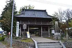 Man betritt den Tempel durch ein großes Tempeltor (山門 Sammon; 1 im Plan), das hier in Form eines Turmtores als Niō-Tor (仁王門 Niō-mon), also als Tor mit den beiden Tempelwächtern (Niō) rechts und links vom Durchgang ausgeführt ist. Die Haupthalle (本堂 Hondō; 2) hat ein Walmdach und ist mit Schilf gedeckt (茅葺 Kayabuki). Der Eingang ist im „chinesischen Stil“ (唐破風 Karahafu) überwölbt. Tokugawa Mitsukuni ließ das Gebäude restaurieren, das mit seinen Fenstern im Katō-Stil und der Ausführung der Kapitelle typisch für die Momoyama-Zeit ist. Die Haupthalle ist als Wichtiges Kulturgut Japans registriert.