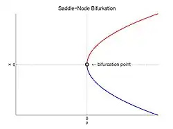 so beeinflussen diese Terme in einer genügend kleinen Umgebung um den Sattel-Knoten-Punkt das Verhalten des Systems nicht. Das heißt, das System ist lokal topologisch äquivalent am Ursprung zur Normalform. Allgemein ist die Bifurkation dadurch charakterisiert, dass ein Eigenwert der Jacobimatrix des dynamischen Systems bei einem kritischen Wert des Bifurkationsparameters Null wird.
