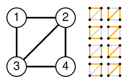 Wir betrachten den vollständigen Graphen mit 4 Knoten, in dem 1 Kante entfernt wurde (wie im Bild rechts). Die Laplace-Matrix L des Graphen ergibt sich aus der Differenz von Valenzmatrix und Adjazenzmatrix wie folgt:
