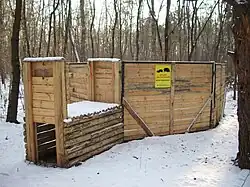 Ein Saufang ist eine Tierfalle für die Fangjagd von Wildschweinen. Es handelt sich dabei um ein mit Falltür samt Auslösemechanismus versehenes Gatter, in das die Wildschweine mittels Lockfütterung (jägersprachlich Kirrung) gelockt werden, um sie anschließend darin zu fangen und zu erlegen. Um den Fangerfolg zu maximieren und ganze Rotten zu fangen, wird dem Wild eine Zeit lang wiederholt ermöglicht, die Kirrung im Saufang unbehelligt aufzusuchen, bevor der Schließmechanismus ausgelöst wird.[1] Während die Falle in früheren Zeiten vor Ort händisch ausgelöst werden musste (siehe nebenstehende Abbildung), sind heute Varianten mit Funkfernbedienung der Falltür und Videoüberwachung des Gatterinneren im Einsatz.[2][3]