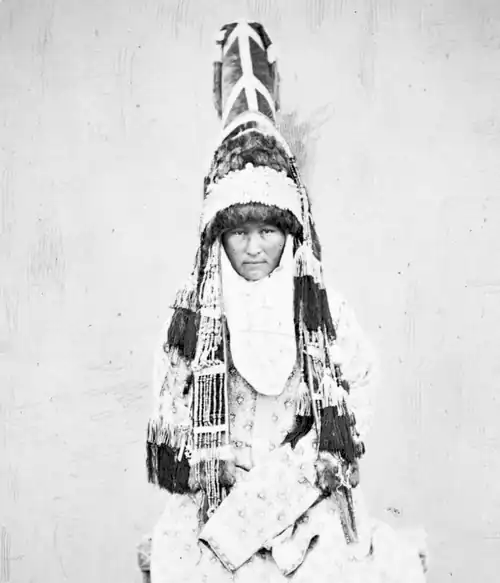 - ↑ old.unesco.kz: Saukele - a nupital headgear (mit Abbildung). Abgerufen am 13. Dezember 2016.