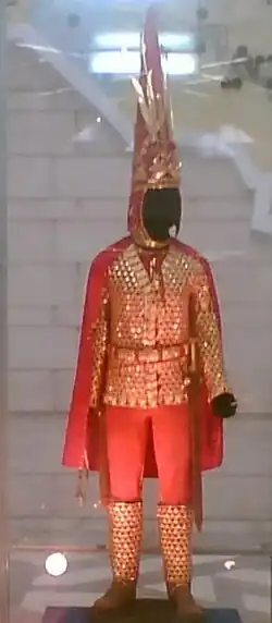 - ↑ a b c d e f g http://e-history.kz/, S. Zh. Asanova: Saukele. Almaty 8. August 2013. Aus: A Study of History of folk costume (englisch). Abgerufen am 7. Dezember 2016.