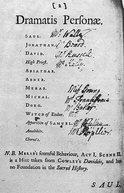 - ↑ Der Nachricht vom 16. Januar 1739 in der „London Daily Post“ zufolge, wurde diese Rolle auch von Mr. Russell, demzufolge aber als Tenor, gesungen. Siehe Percy M. Young in Händel, Saul. Oratorio in three acts/Oratorium in drei Akten, Kassel, Bärenreiter, 2009, S. IV. Auf der anderen Seite erscheint es wenig wahrscheinlich, da David und Abner in einem Rezitativ (Nr. 8) singen müssen.