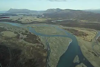 ![]() Oberlauf des Savonoski River; links und rechts oben im Bild der Hook-Gletscher | ||