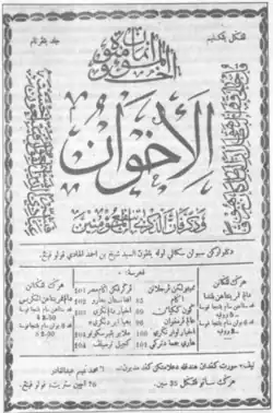 Im September 1926 wandte sich al-Hadi nach langer Zeit wieder dem Journalismus zu und startete eine neue Monatszeitschrift mit dem Titel Al-Ikhwān („Die Brüder“), die als Fortsetzung von al-Imam konzipiert war.[65] Der Titel nahm auf das Koranwort „Die Gläubigen sind doch Brüder“ (Sure 49:10) Bezug, das auch in kalligraphischer Form auf dem Titelblatt jeder Ausgabe abgedruckt war. Im Editorial der ersten Ausgabe erklärte er, welches Publikum er mit dieser Zeitschrift vor Augen hatte und welches Anliegen er mit ihr verfolgte: