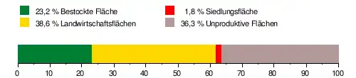 Es besteht zu 23,2 % aus bestockter Fläche, zu 38,6 % aus Landwirtschaftsfläche, zu 1,8 % aus Siedlungsfläche und zu 36,3 % aus unproduktiven Flächen.