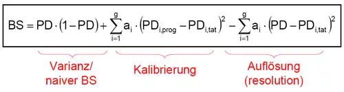 - ↑ Siehe beispielsweise Frerichs, Wahrenburg (2003, S. 16, eigene Notation). In einer Simulationsstudie finden die Autoren, dass der gruppierte Brier-Score nicht als Validierungskenngröße für Ratingsysteme geeignet ist, da er nicht in der Lage ist, „unterlegene“ Ratingsysteme zuverlässig zu identifizieren.