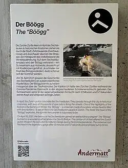 Am 19. April 2021 wurde auf der Teufelsbrücke der Zürcher Böögg verbrannt. Da während der Corona-Pandemie in Zürich das traditionelle Sechseläuten nicht durchgeführt werden konnte, bot der Gastkanton Uri den Zürchern in der Schöllenen Gastrecht. Als Anlehnung an den Standort hielt der Böögg anstelle eines Besens einen Dreizack in der Hand. Er verlor nach 12 Minuten und 57 Sekunden seinen Kopf.[12]