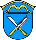 Blasonierung: „In Blau ein waagrechter goldener Bogen mit goldener Sehne über zwei gekreuzten silbernen Schnitzmessern mit goldenen Griffen.“ |