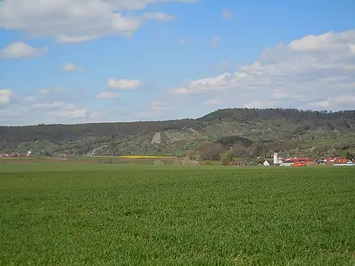 Die Südlage und die kargen Böden am Hang (Mergelböden und Mittlerer Keuper) waren die Voraussetzung für Streuobstwiesen und Weinberge. Die Streuobstwiesen im Foto – leicht verborgen hinter einer den Wirtschaftsweg säumenden Baumreihe – liegen noch im Naturschutzgebiet. Der hier sichtbare, von Breitenholz bewirtschaftete Weinberg, ist aus dem Schutzgebiet ausgenommen.