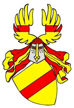 Roter Querbalken in Gold. Auf dem Helm mit rot-goldenen Decken ein wie der Schild bezeichneter offener Flug. Schildvarianten: Balken mit einem Kreuz belegt; im rechten Obereck ein Stern; über dem Balken ein Turnierkragen. Helmziervarianten: zwei wie der Schild bezeichnete Hörner; zwischen den Hörnern eine wachsende Jungfrau, ein gekrönter Jünglingsrumpf, Mohrenrumpf.[1]