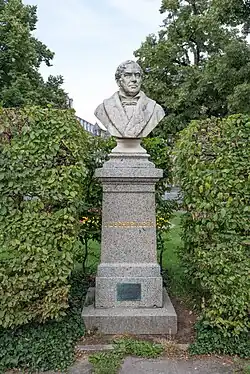 Nach dem Tod des königlich preußischen Medizinalrates Johann Lukas Schönlein im Jahr 1864 bildete sich spontan ein Comité zur Errichtung eines Denkmals.[Anm 2] Die beschränkten finanziellen Mittel führten dazu, dass von der Errichtung eines aufwändigen Erzstandbildes abgesehen wurde. Schließlich entschloss man sich, eine monumentale Büste aus Carrara-Marmor zu errichten, die Caspar von Zumbusch nach Bamberg schickte.[Anm 3] Da die Büste auf dem weitläufigen Platz leicht übersehen werden konnte, errichtete man sie auf einem kleinen Hügel. Der Vorstand der Schützengesellschaft Griesbeck schrieb damals an die kommunalen Baubeamten Pastor und Herd: „Den Magistrat der k. Stadt Bamberg ersucht die Schützengesellschaft ganz ergebenst, geneigtest erwägen zu wollen, ob der Hügel der städtischen Anlagen um das Schönleins-Monument nicht abzutragen wäre und glaube diesen Antrag damit motivieren zu können, daß dadurch der Neubau der Schützengesellschaft sich besser vom Boden abheben würde und damit auch eine Verschönerung des schönsten Platzes der Stadt bewirkt würde.“[Anm 4]