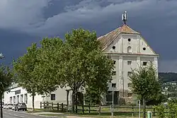 Der Schüttkasten hat vier Geschoße und ein Krüppelwalmdach.[2] An der Nordfront zeigt der ehemalige Getreidespeicher das Wappen der Familie Batthyány.