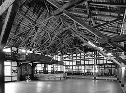Die Fachwerkkonstruktion ist auch von innen sichtbar. Die Raumwirkung wird insbesondere durch die freiliegenden Dachbalken geprägt. Anders als von außen suggeriert, nimmt der Saal den gesamten Innenraum ein. Die Halle bleibt hierbei auch weitgehend ungegliedert und nur ein kleiner Raumteil wird durch Pfeiler abgeteilt. Auf Höhe des oberen Fensterbandes ist über der Tür ein Balkon angebracht. Die Große Theke befindet sich im südlichen und die Kleine Theke im östlichen Teil.