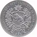 | Schaffhausen | 1865 | 5 Franken | Silber | Antoine Bovy | 37 mm | 10,000[* 9] |