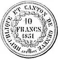 | Genf | 1851 | 10 Franken | Silber | Antoine Bovy | 48 mm | 1,000[* 3] |