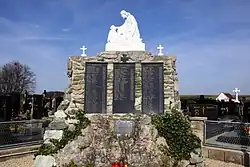 Blasonierung: „In Rot und auf goldenem Grund aufgerichtete und einander zugewandte Löwen; zwischen ihren Füßen eine goldene Garbe, mit den Pranken eine aufrechte, mit der Schneide nach links gewandte blaue Pflugschar haltend, überhöht von einer goldenen Blätterkrone, die von goldenen Ähren begleitet wird.“[23] Die Gemeindefarben sind rot–gold–blau. |