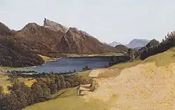 Im Herbst 1847 verbrachte der Dachsteinforscher Friedrich Simony sieben Wochen am Gipfel des Schafbergs und zeichnete bei der klaren Sicht im Herbst ein Panorama der Schafberg-Aussicht. Neben seinen Dachsteinbildern zählt das Schafberg-Panorama zu seinen bekanntesten Werken.[61] In der Biedermeierzeit kamen Landschaftsmaler in das Salzkammergut und zum Schafberg. Ferdinand Georg Waldmüller, August Schaeffer von Wienwald und Friedrich Gauermann schufen Werke mit dem Schafberg und dessen Umgebung.