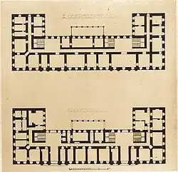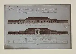 Baumeister des 1720 errichteten „Stiegenhauses“ war vermutlich Elias Scholtz. Den Auftrag zum Umbau von 1773 erhielten der Hirschberger Maurermeister Christian Seidel und der Stadtzimmermeister Wilhelm Predow. Das zweigeschossige Haus hatte einen rechteckigen Grundriss von 58 mal 32 Ellen (36,7 mal 21,3 m), 9 Fensterachsen längs und 4 quer. Die drei mittleren Fensterachsen der Längsfront waren mit dem Portal gruppenartig zusammengeschlossen und von einem Giebel bekrönt, der in den unteren Teil des gebrochenen Walmdaches hineinragte[14].