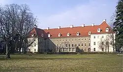 Für das 1777 abgebrannte Renaissanceschloss des 16. Jahrhunderts ergibt sich aus den in die Pläne zum Neubau von 1784 eingezeichneten Grundmauern, dass es ein Geviert von 58 Ellen (36,7 m) im Quadrat um einen Innenhof ohne Arkaden war. Alte Stadtansichten[12] zeigen ein zweigeschossiges Gebäude mit einfachem Satteldach und Treppengiebeln, die an eine Miniaturausgabe des Schlosses Oels (von den Herzögen von Münsterberg zwischen 1558 und 1617 in die jetzige Form gebracht) denken lassen. Auf seinen Fundamenten steht die Nordwestecke des heutigen Schlosses[13].