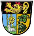 Der Schild ist geteilt und unten gespalten. Oben in Schwarz der wachsende rot-gekrönte und rot-bewehrte goldene Pfälzer Löwe. Unten rechts in Blau der goldene Hirte hinter liegendem silbernen Schaf auf grüner Wiese. Unten links in Gold eine grüne Rebe mit einer grünen Traube.