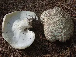 Das Bild zeigt Albatrellus ovinus, die Typusart der Gattung. Die Pilze sind in Hut und Stiel gegliedert und haben eine porige Fruchtschicht. |