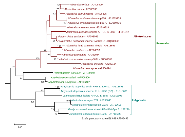 - ↑ Ellen Larsson, Karl-Henrik Larsson: Phylogenetic relationships of russuloid basidiomycetes with emphasis on aphyllophoralean taxa. In: Mycologia. Band 95, Nr. 6. The Mycological Society of America, 2003, S. 1037–1065 (mycologia.org [PDF; 1,2 MB]).